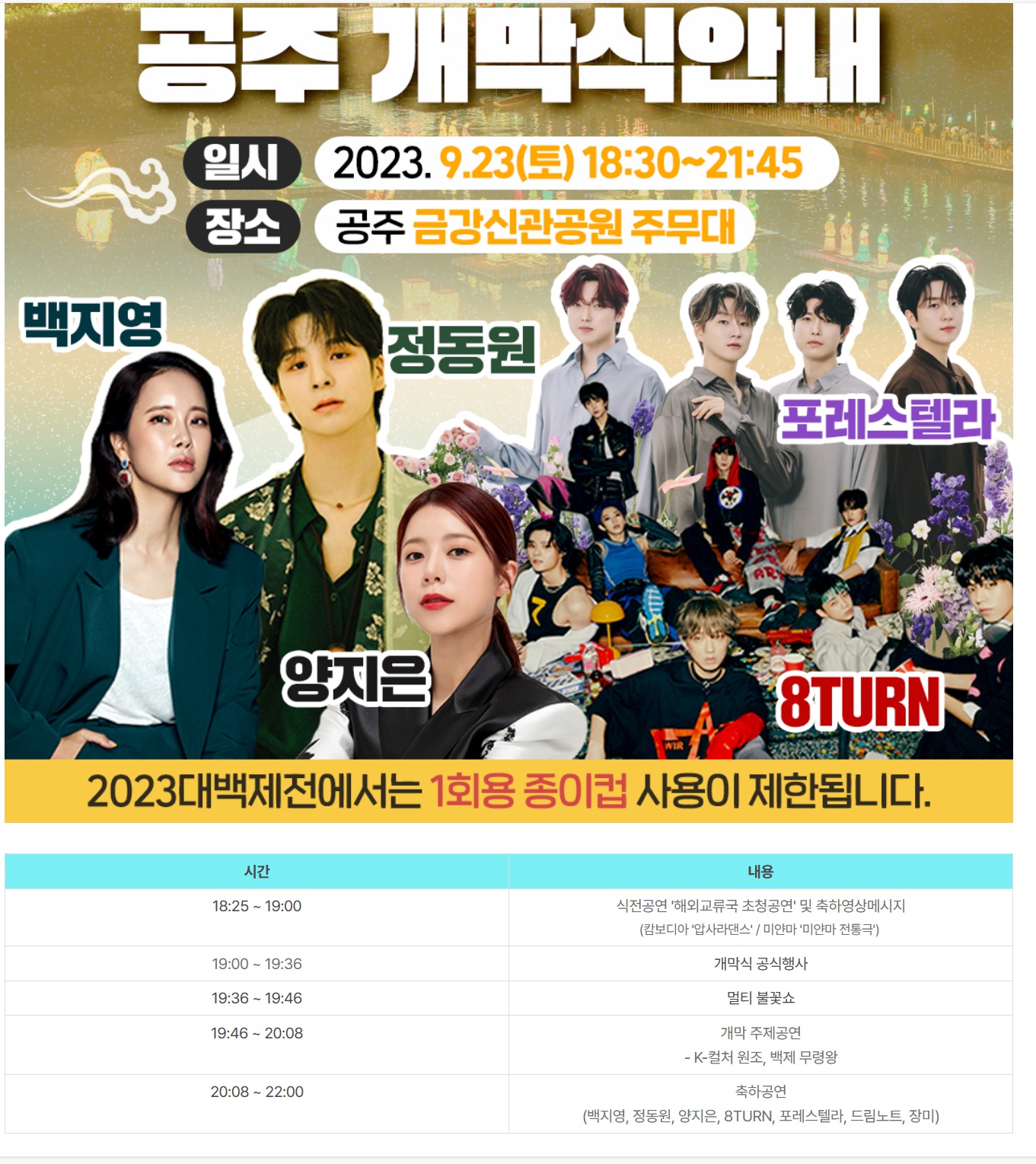 - 일시 : 2023-09-24(일) ~ 2023-10-08(일) 공주(19:40/21:20/22:00), 부여(19:50/21:30)