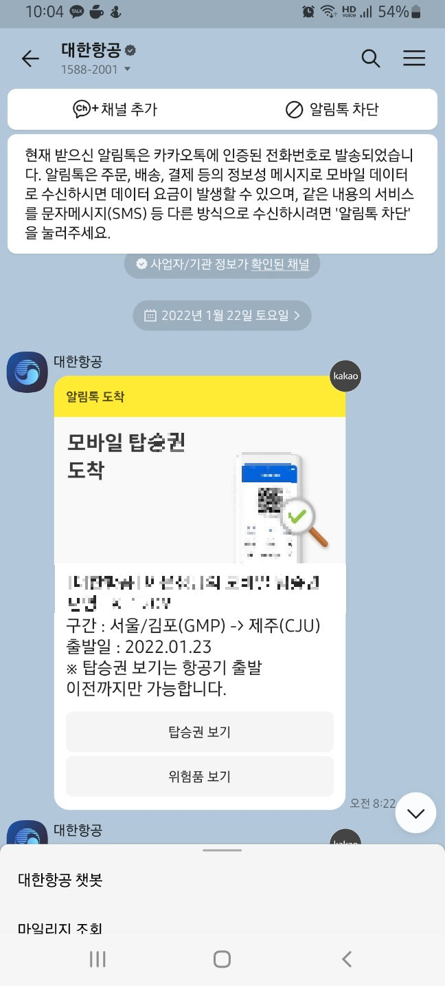 여름 휴가를 앞두고, 대한항공으로 부터 모바일 탑승권 체크인 메세지를 받았습니다.