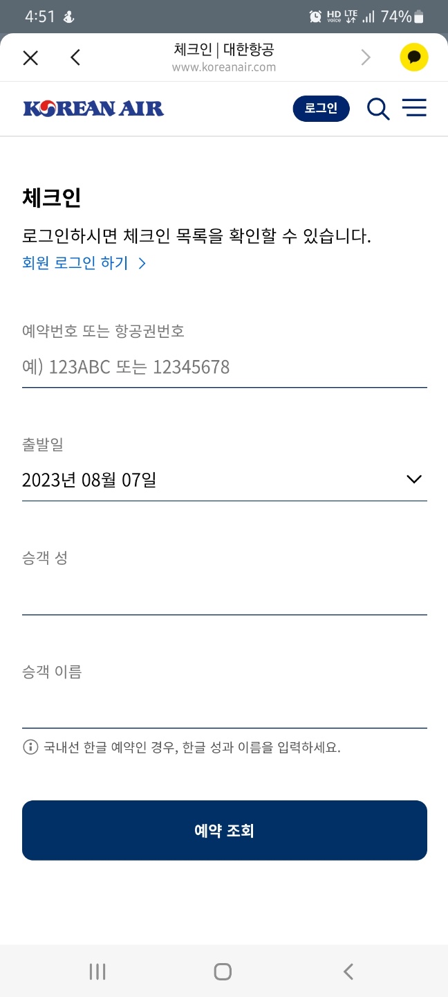 그러면 이제 탑승권 온라인 체크인을 시작해 봅니다.