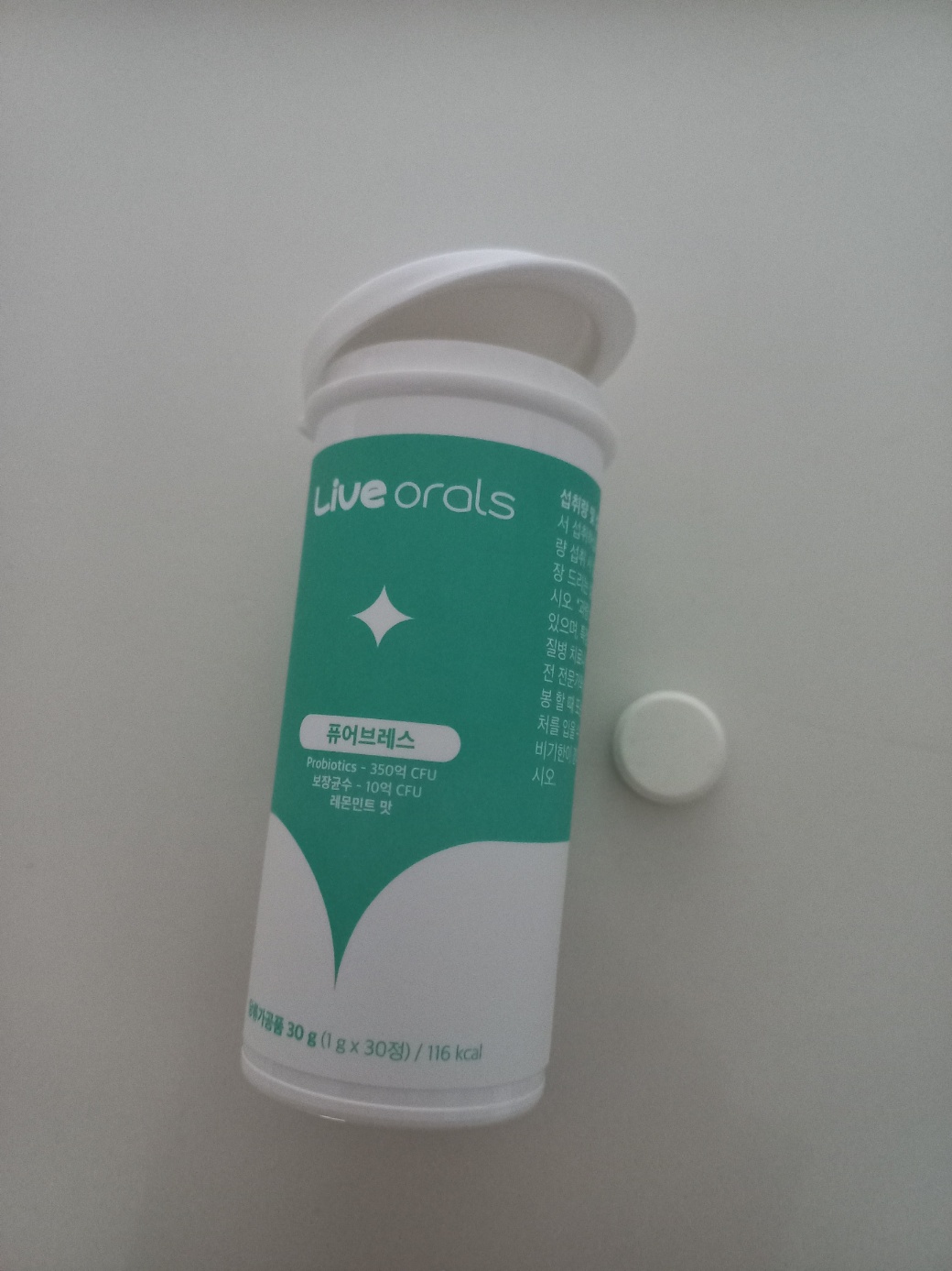 우선, 350억 투입유산균이라 구매했는데 10억보장?유산균이라 단상자에 쓰여있습니다. 일단 시작은 조금 당황스러웠습니다. 홍보는 350억에 혹했는데..... 맛은 향료가 들어갔으니, 불쾌하지 않게 적당하게 먹을 맛입니다. 사실 전성분을 굉장히 신경쓰는 사람으로써 이 향료는 정말 피하고 싶은 재료입니다. 매일 먹는 유산균......그래도 온가족, 임산부도 먹을 수 있을 정도의 향료니까 일단 OK(구내염이 더 불편하니까) 섭취한지 일주일 되었는데 구내염 없다? 이것은 사실입니다. 평소 에너지활동량이 많은 사람이라 몸에 열도 많고 백태가 끼는 스타일인데, 백태도 어느 정도 잡아주고, 구내염도 아주 잘 예방해주고 있습니다. 굳히 비교하자면 다른 구강유산균들 대비, 백태가 조금 덜 생기는것 같고 구내염도 아직까지는 잘 예방해주고 있는것 같습니다. 가격으로 비교하자면, 다른 제품들이 조금 더 효율성이 있는것 같으나, 백태의 관리와 구내염을 예방해주는것으로 보아 라이브오랄스 제품 구매할 가치는 있다고 생각합니다. 또한 3개월이상 섭취 시 더욱 효과가 좋아진다하니, 그것까지 감안한다면 괜찮은 것 같습니다. 제가 임산부시절에 먹덫으로 먹고 자고 먹고 자고 일상을 해서 입냄새 걱정을 하던 먹덪의 시기가 있었는데 임산부들도 섭취가 가능하다고 하니 그런 고민이 있는 임산부들도 그런 시기에 꼭 섭취하라고 추천하고 싶습니다.