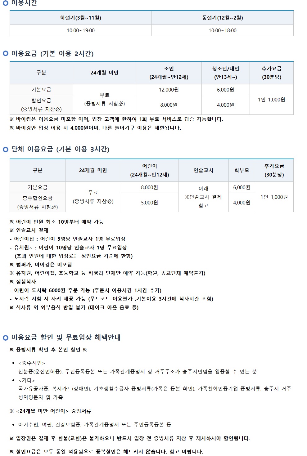 2. 이용 요금은 기본 2시간 (24개월미만 무료, 12세이하 12,000원, 대인 6,000원)