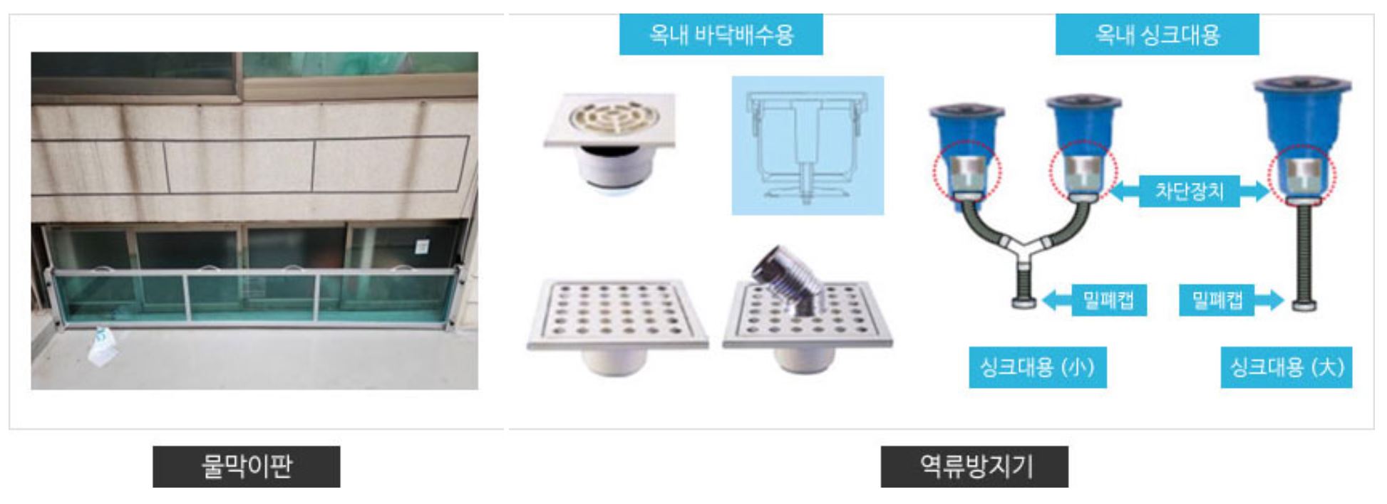 - 역류방지시설 : 화장실, 싱크대 등의 하수가 역류되는 것을 막아준다.
