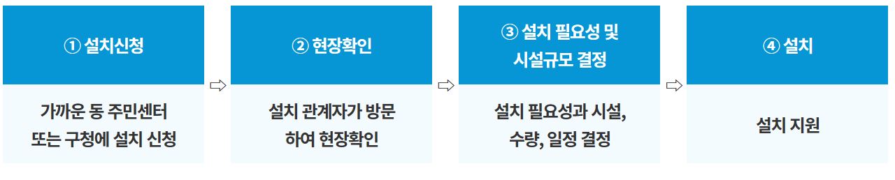 지원대상가구가 동주민센터로 신청하면 담당자가 현장을 방문해 설치 필요성과 시설,물량을 결정한 후 설치공사를 추진하게 됩니다. 세입자가 신청 시에는 건물 소유주의 동의가 필요합니다. 설치 공사비는 무료 입니다.