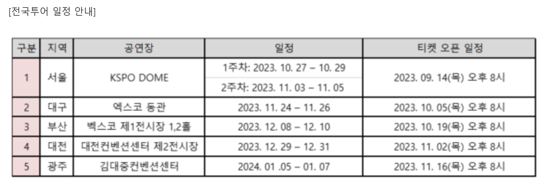 - 티켓오픈 : 2023년 10월 5일(목) 오후 8시 (인터파크 단독판매)